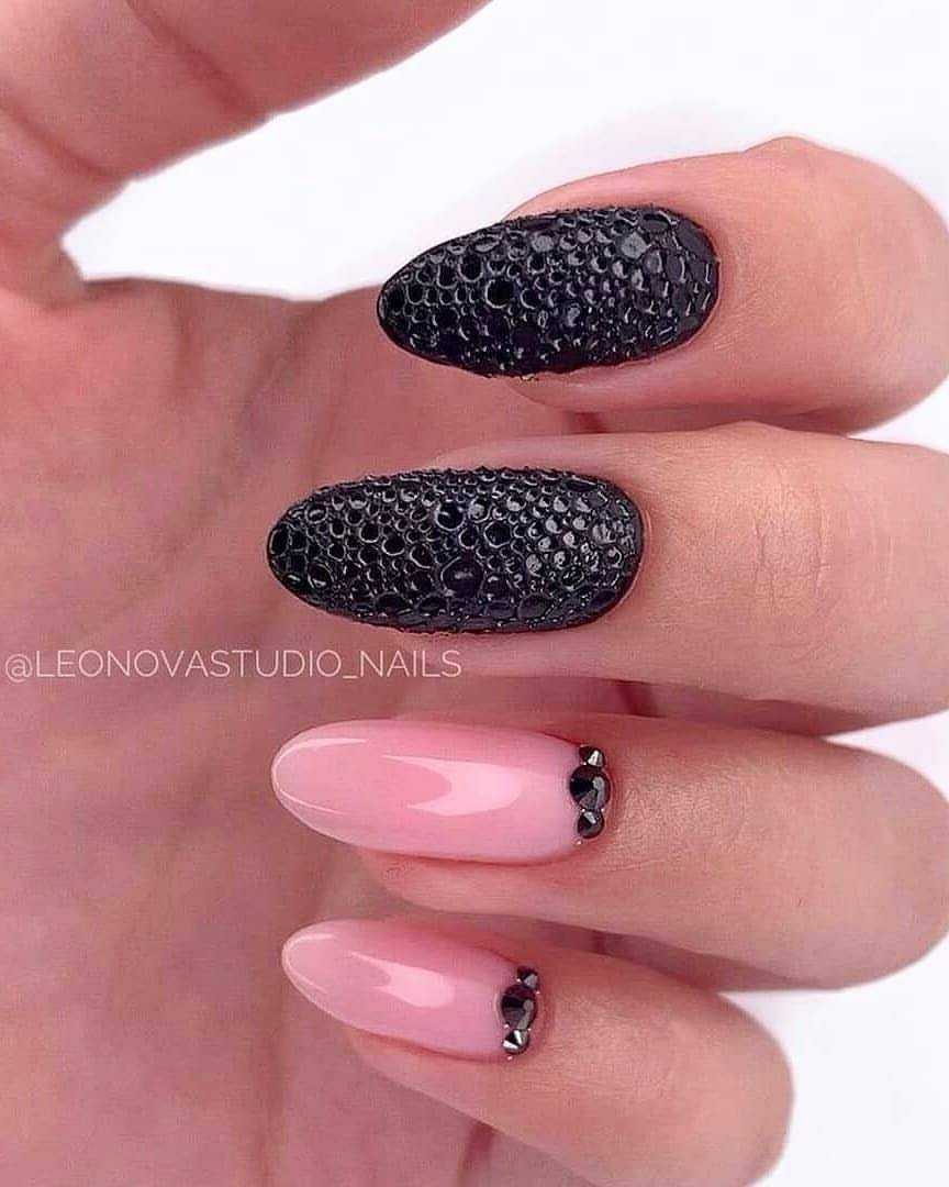 Что касается темных оттенков, то тут стоит быть осторожнее. Не рекомендуется покрывать однотонным черным гель-лаком длинные ногти стилеты, квадратные ногти. Если вы все же решили использовать темный оттенок в качестве основного, то дополняйте его геометрическим декором, серебряным глиттером, слайдерами.