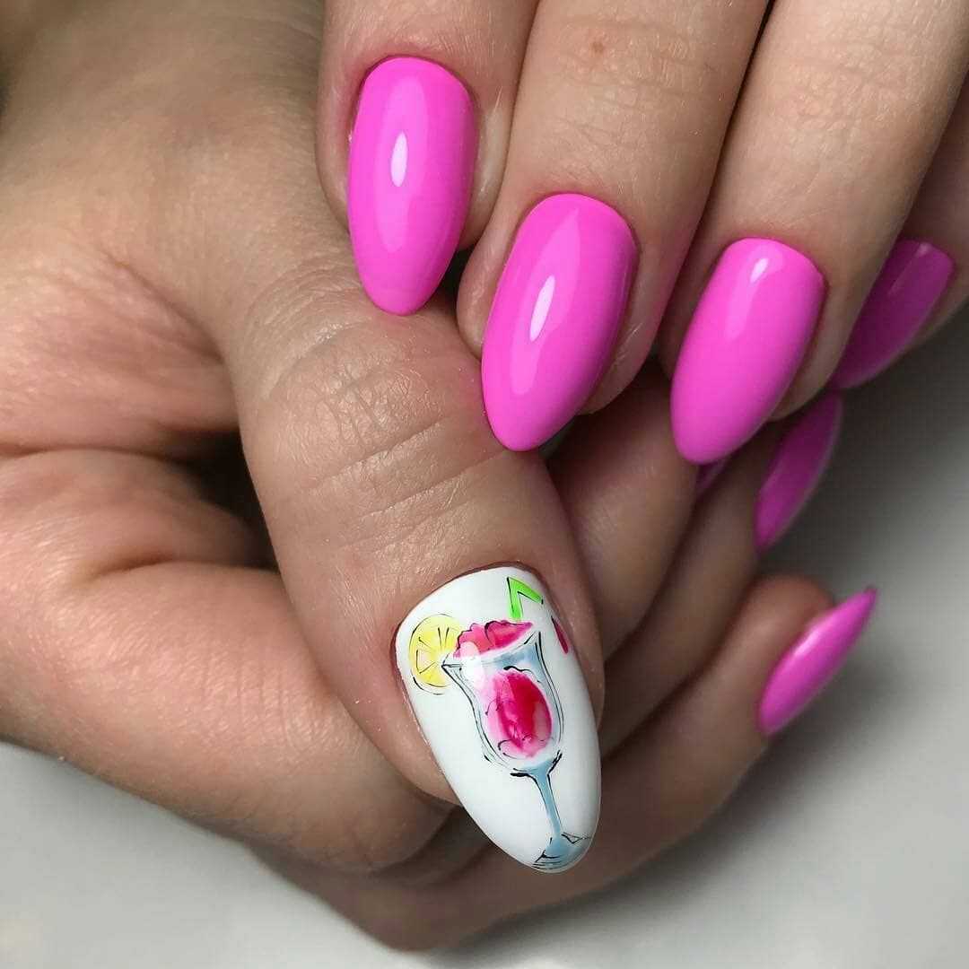Маникюр с фруктами изменился по сравнению с нейл-артами предыдущего летнего периода. Сегодня дизайн с фруктами – это узоры на 1-2 акцентных ноготках, остальные ноготки чаще всего покрывает однотонным гель-лаком.