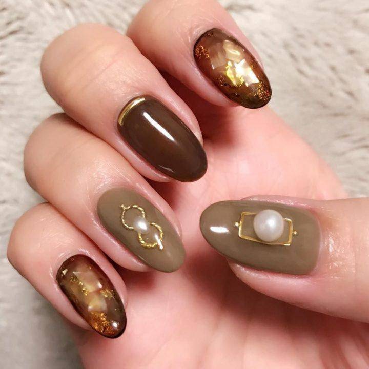 Янтарный вид маникюра красиво имитирует поверхность натурального камня. В красках используется темный, янтарный, коричневый, песочный, бежевый и черные тона. Краски дополняют один другого позволяя создавать потрясающую картину.