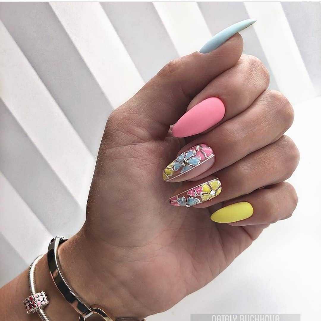 Цветовые решения летнего яркого маникюра 2020 чудесным образом переплели в себе ауру времени года, ожидание релаксации и лёгкую праздничную атмосферу, поэтому самые модные оттенки заимствованы у природы, в периоды активного роста растений и пышных цветений. Мода 2020 культивирует смелое сочетание нежных и сочных оттенков, представленных в самых необычных вариациях. Для модного разноцветного маникюра актуальны оригинальные чередования оттенков, футуристичные и реалистичные изображения цветов, травинок, веточек, фруктово-ягодные сюжеты, блестящие переливы втирки, смелые переходы градиента и многие другие идеи.