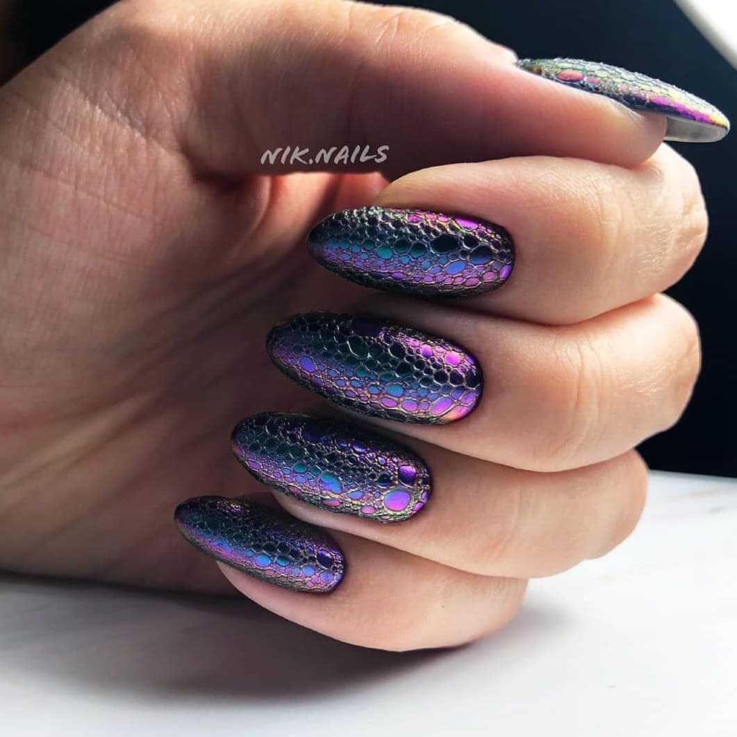 Еще один хит летнего сезона – втирка. Блестящий эффект создает праздник на ноготках. Дизайн хорошо смотрится без декора, но вы можете добавить рисунки, чтобы создать бомбический эффект. Втирка лучше всего сочетается с абстракцией, растительными мотивами, животными принтами и ажурными узорами.