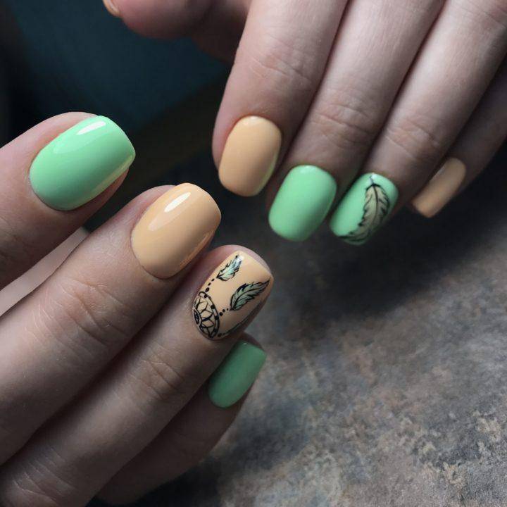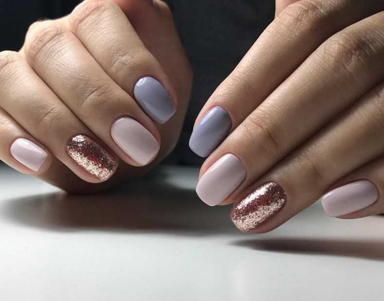 Этот тип маникюра идеально смотрится на ногтях одинаковой формы и длины. Можно все ногти одной руки накрасить разным лаком, но цвета должны сочетаться.