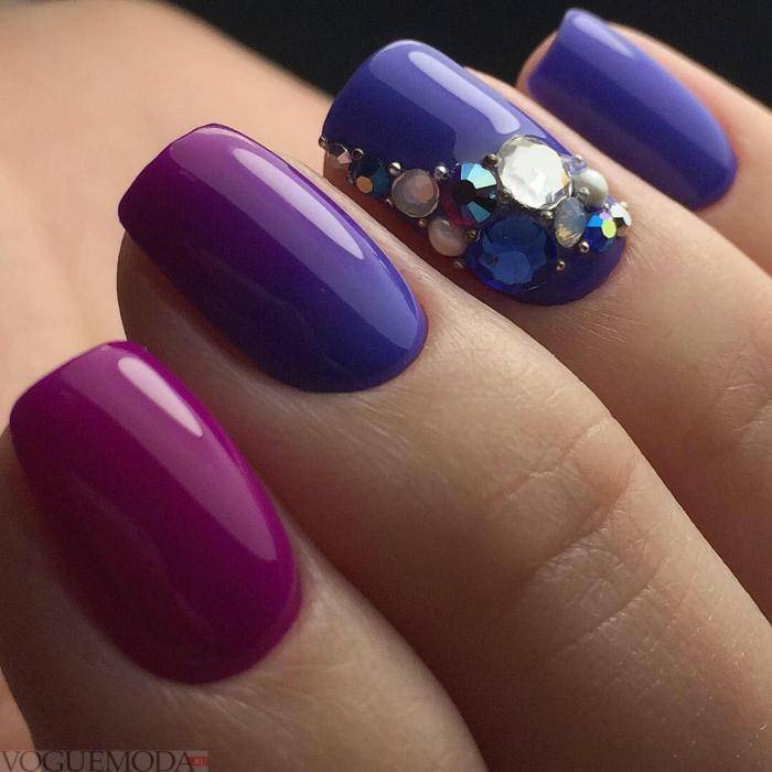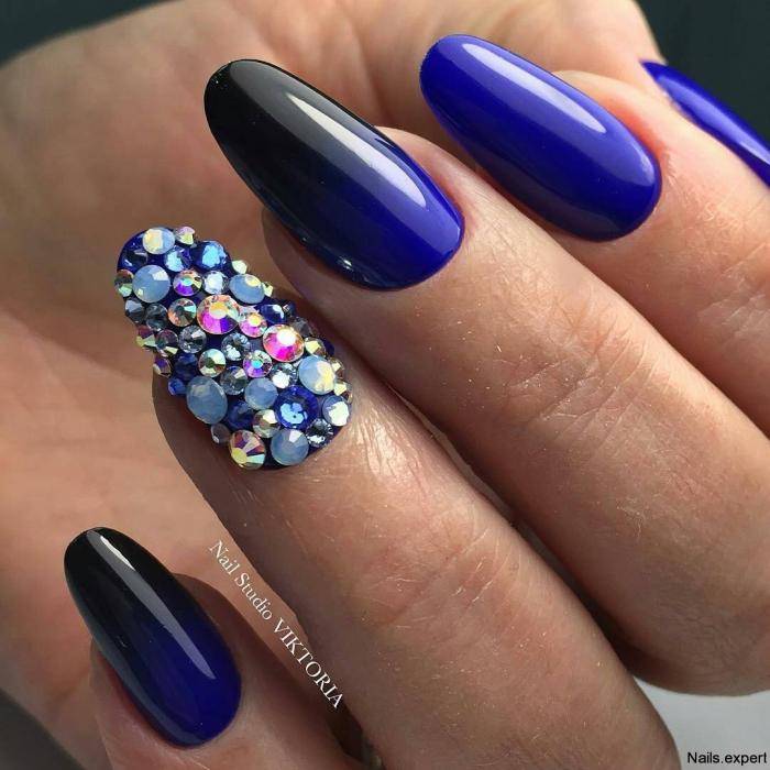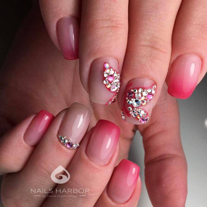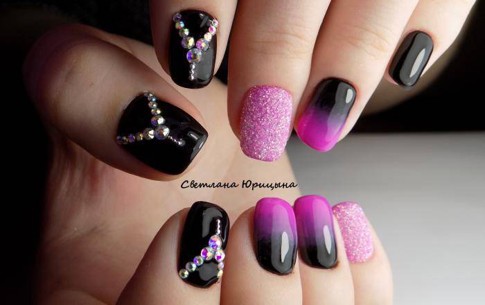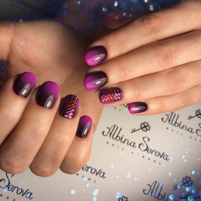 Градиентный маникюр вполне можно сочетать с блестками, стразами, фольгой, рисунками.
