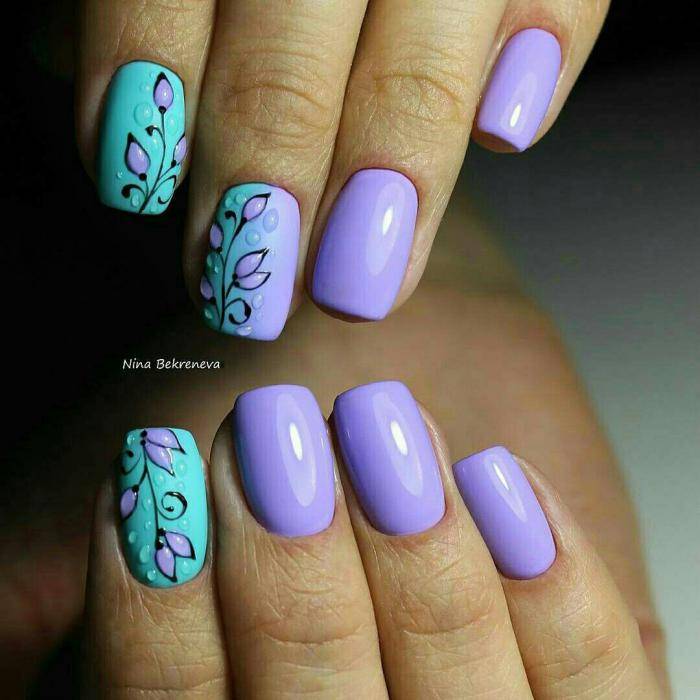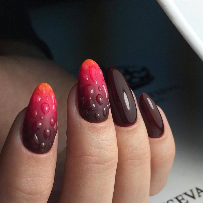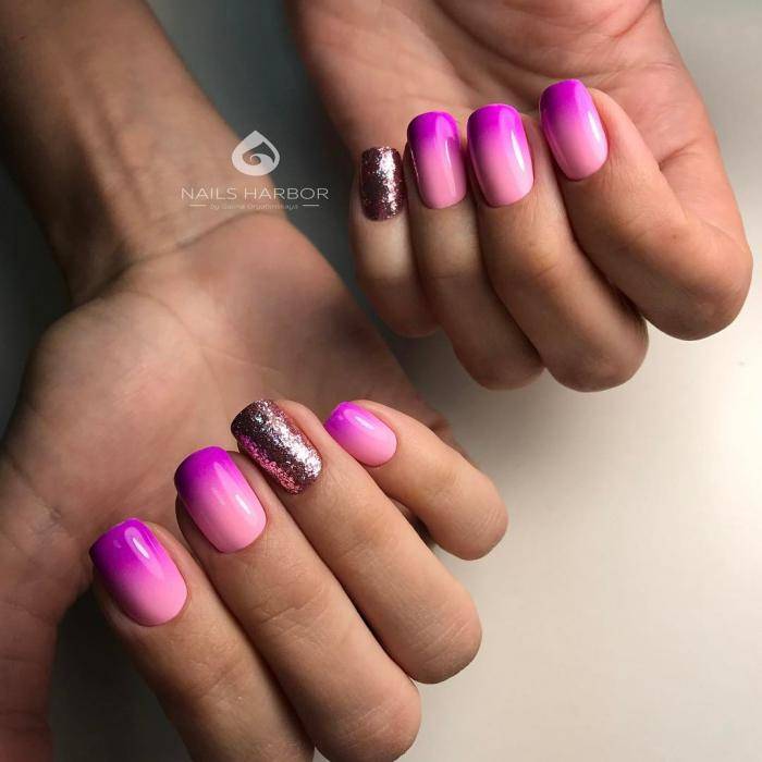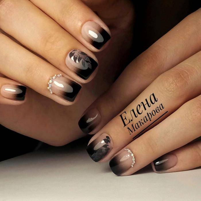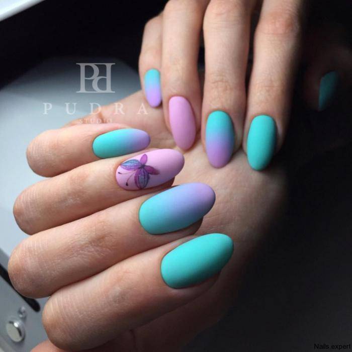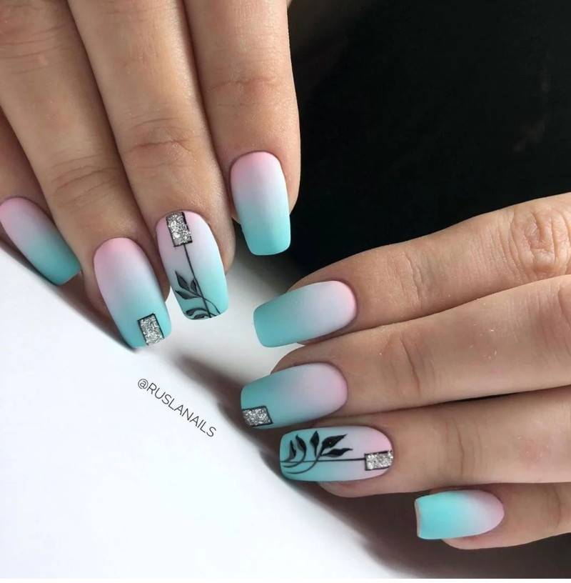 Если вы обладаете хорошим чувством стиля и фантазией, то вы можете попробовать сделать градиентный маникюр с дизайном.