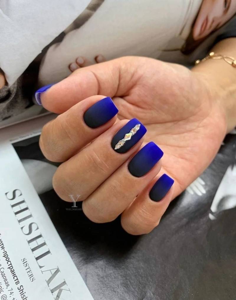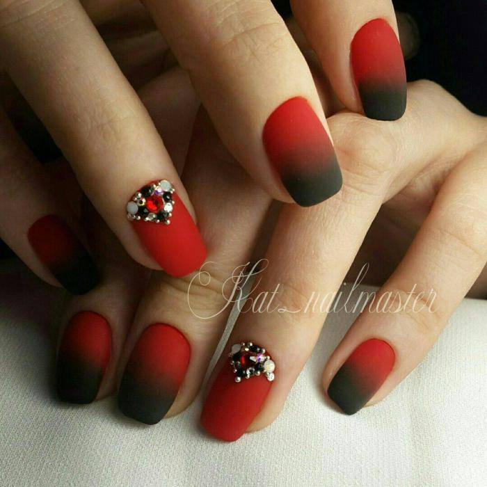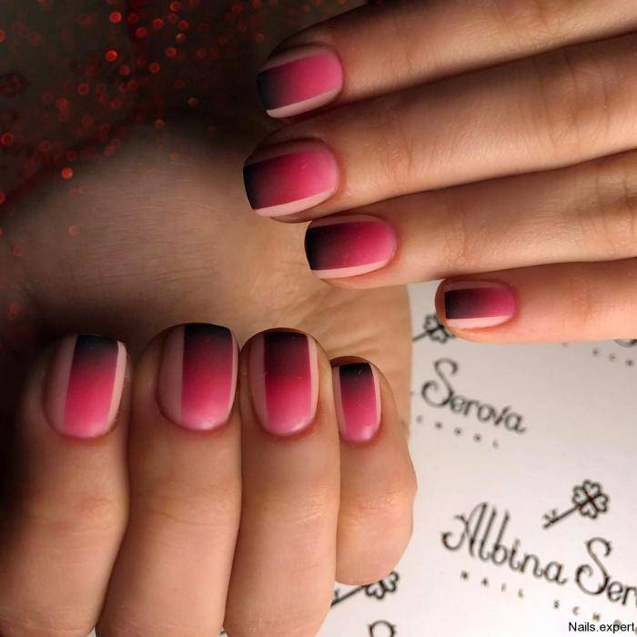 К примеру, матовый маникюр омбре, который смотрится более сдержанно и лаконично, чем вариант с использованием обычного лака.