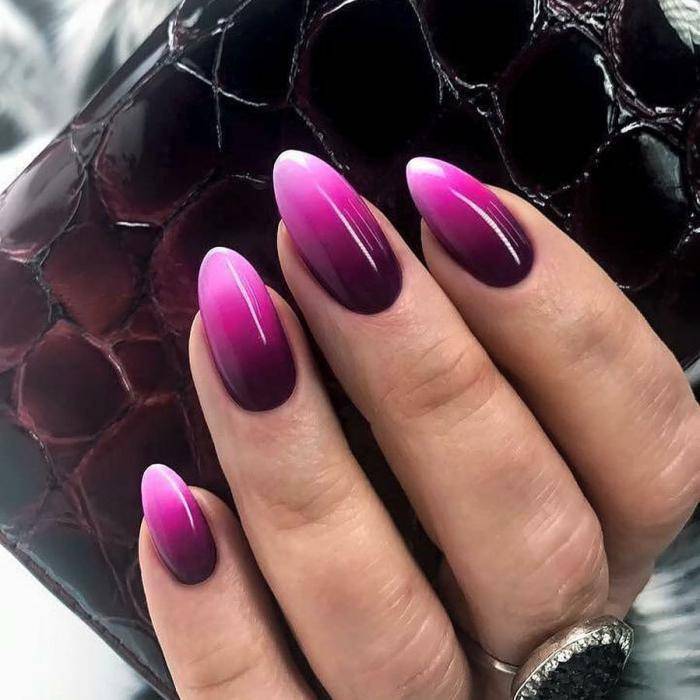 Подбирая для маникюра омбре гели и лаки, лучше не экспериментировать со средствами с эффектом хамелеона. В данном случае практически невозможно заранее предугадать, каким будет результат.