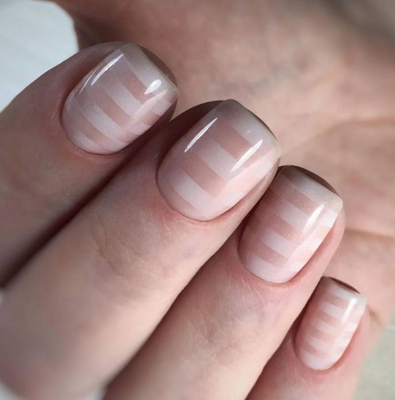 Для следующего этапа потребуется тонкая и упругая кисточка, неважно, синтетическая или из натурального меха. Держа ее параллельно ногтю, аккуратными и мягкими движениями без нажима лак растушевывают тонкими полосками в сторону кончика