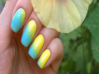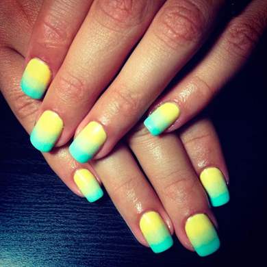 Теперь от основания ногтя нанесите до середины один цвет, а затем, от кончика ногтя нанесите второй цвет. Возьмите самую тонкую кисточку и аккуратно соедините два цвета, сделав плавное перетекание одного в другой. При работе с каждым ногтем следует вытирать кисточку, чтобы цвет получался насыщенным и ярким, а не грязным и блеклым. Нанесите топ и просушите ногти под лампой.