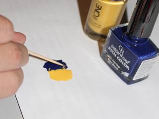 Приготовленный заранее кусок фольги или другое подручное средство мы будем использовать в качестве палитры. Наносим на свою палитру две или более полоски лака различных оттенков и немного смешиваем цвета иголкой для получения плавного перехода цвета. Цвета обычно располагают в следующей последовательности: наиболее светлый оттенок «ложится» на основание ногтя, за ним оттенки располагают по принципу нарастания тональности, самый темный тон приходится на кончик ногтевой пластины.