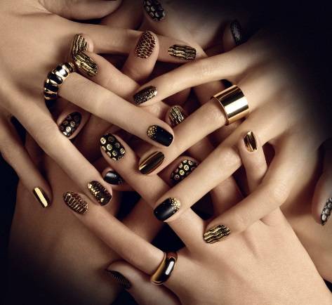 Золотой цвет следует использовать максимально осторожно; если в элементах не используются оттенки золота, лучше использовать не полное покрытие, а частичное или просто золотой декор для нейл-арта.
