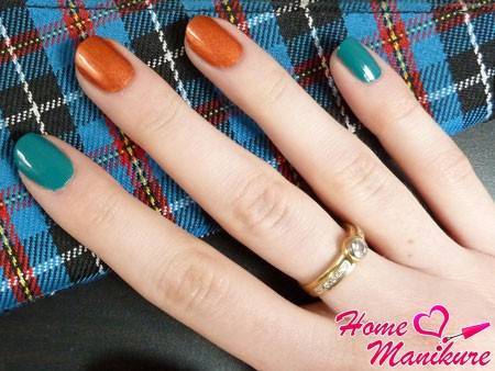 Для начала нужно выбрать те пальцы, на которых предполагается сделать акцент и покрасить их лаком, цвет которого подобран в соответствии со стихией. К примеру, чаще всего выделяют безымянный и средний пальцы правой руки. Остальные ногти можно оформить под определенный наряд или в соответствии с желанием.