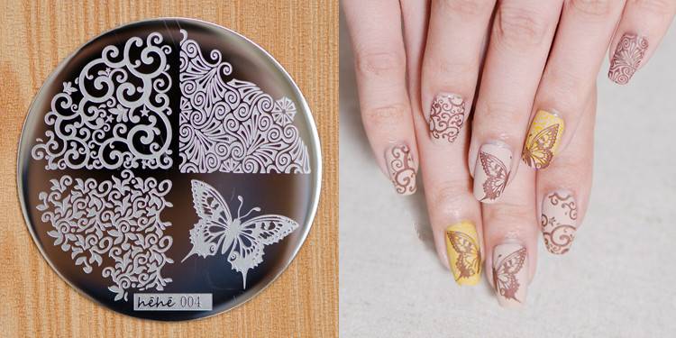 - Многоразовые трафареты для дизайна ногтей чаще всего сделаны в виде металлического или пластикового диска или пластины с рисунком. На ноготь они переносятся при помощи специального инструмента — штампа. Техника носит название «стемпинг». Эти трафареты очень прочные и долговечные, не приходится тратиться на покупку новых, к тому же один рисунок можно повторить на нескольких ногтях.