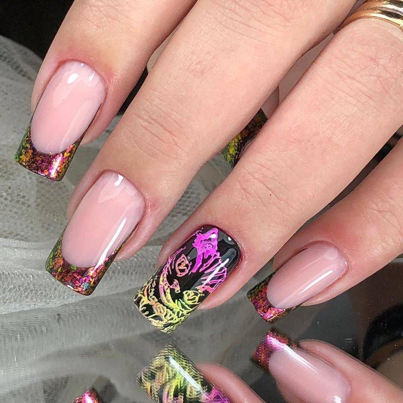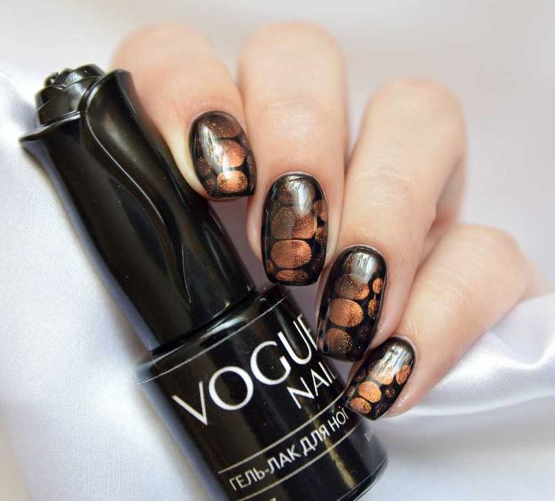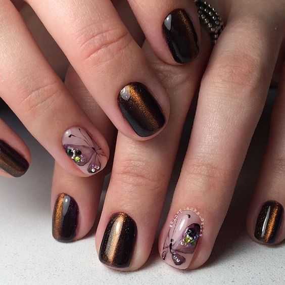 Данная цветовая гамма весьма специфическая, поэтому ее долгое время не использовали для создания такого маникюра. Но те мне менее сейчас это очень часто практикуется, а настоящие модницы в восторге от такого решения. Что касается декора, то нейл-мастера рекомендуют от него отказаться или же выбрать лаконичные детали в тон. Главное, чтобы они не были слишком контрастными.