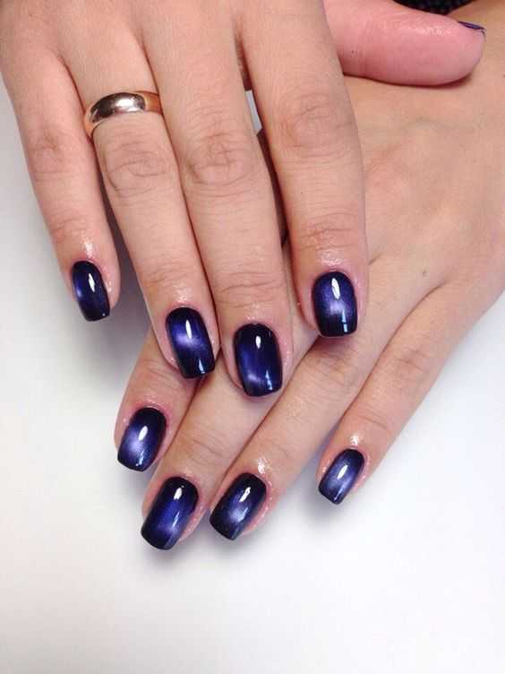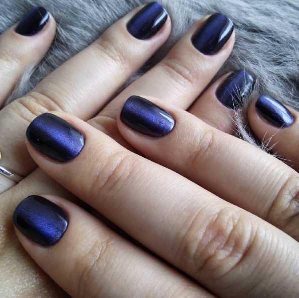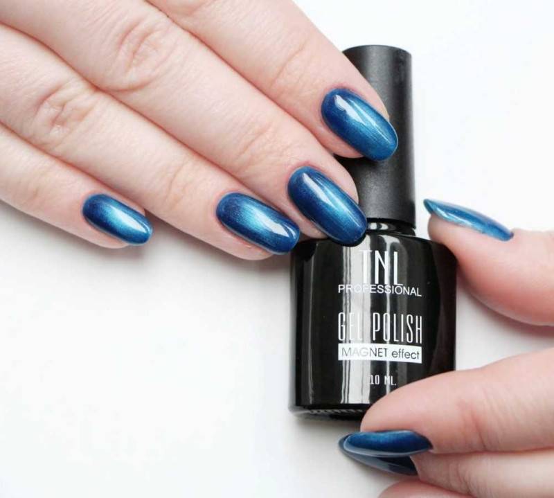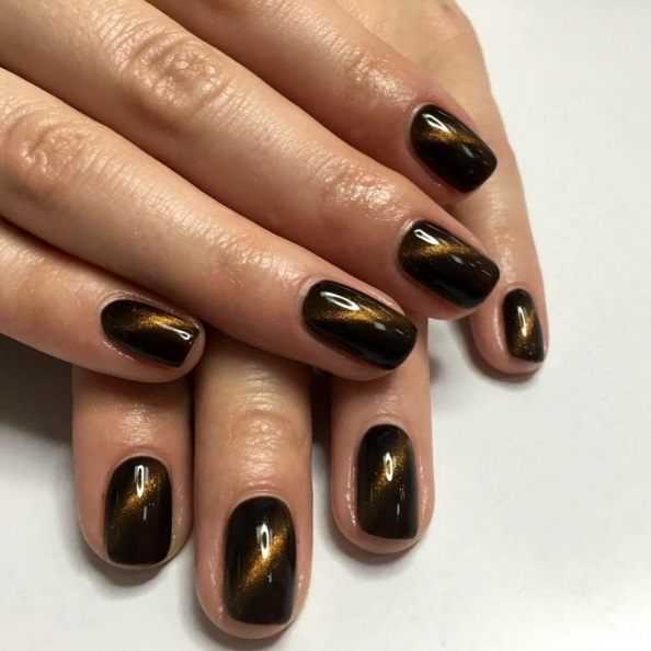 Не менее популярен гель-лак с эффектом «кошачий глаз». Содержит металлизированные частицы. Сразу после нанесения на ногтевую пластину к ней максимально близко подносят специальный магнит. Благодаря этому получается показать глубокий перелив, как глаза у кошки. Такой дизайн выглядит невероятно красиво, поэтому его часто выбирают в качестве вечернего маникюра. Но помните, что рисунок на ногтевой пластине может быть разным, в зависимости от магнита, использованного в процессе дизайна.