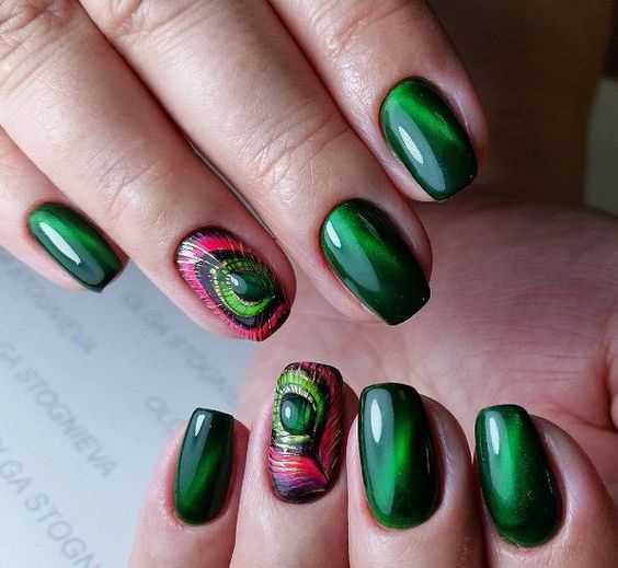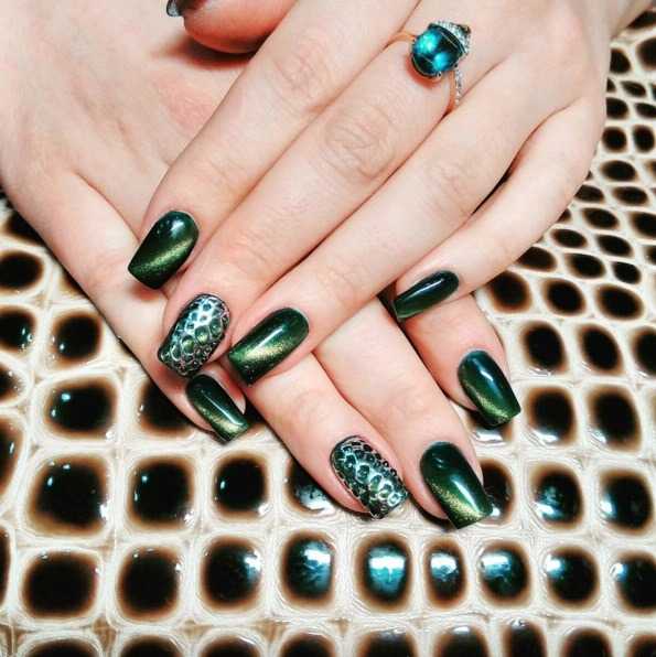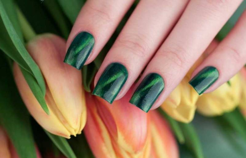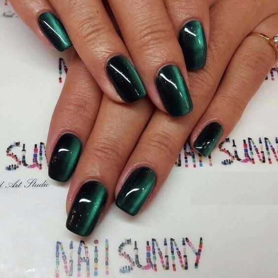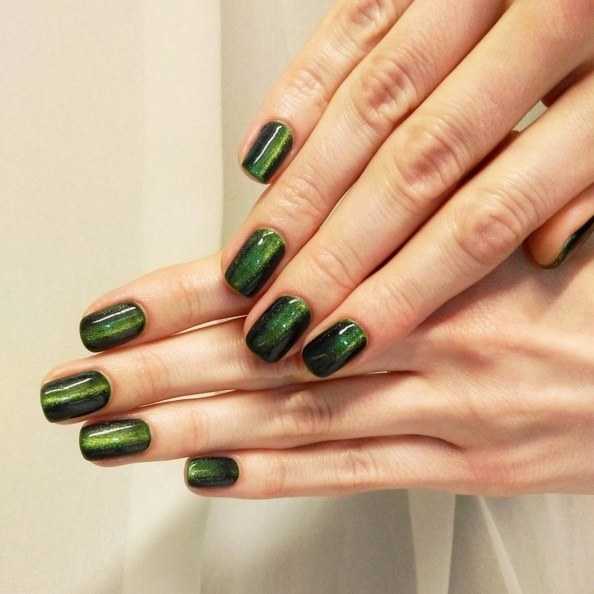 Независимо от модных тенденций, маникюр кошачий глаз в зеленых оттенках сморится потрясающе красиво. Благодаря разнообразию тонов, каждая девушка без проблем подберет подходящий для себя вариант. Но все же отметим, что наиболее выигрышно смотрится оливковый, желто-зеленый и агатово-зеленый цвет.