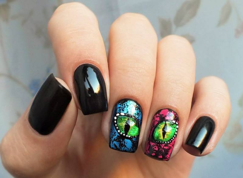 Глаза кошки. Зеленые глазки, сверкающие во тьме, лучше всего смотрятся на черном фоне. В таком дизайне полно загадочности и хитрости. Для дискотеки можно использовать неоновый зеленый лак.