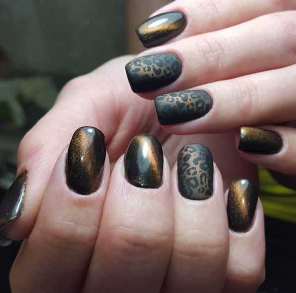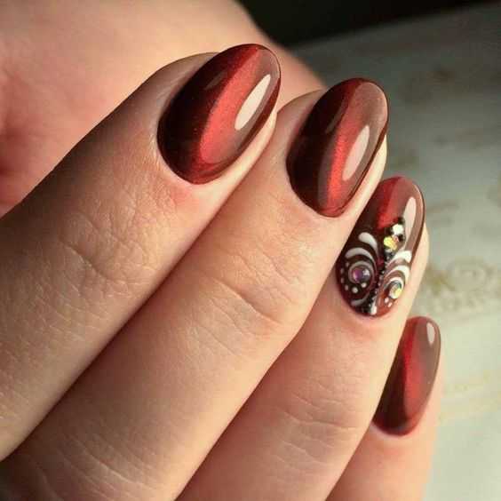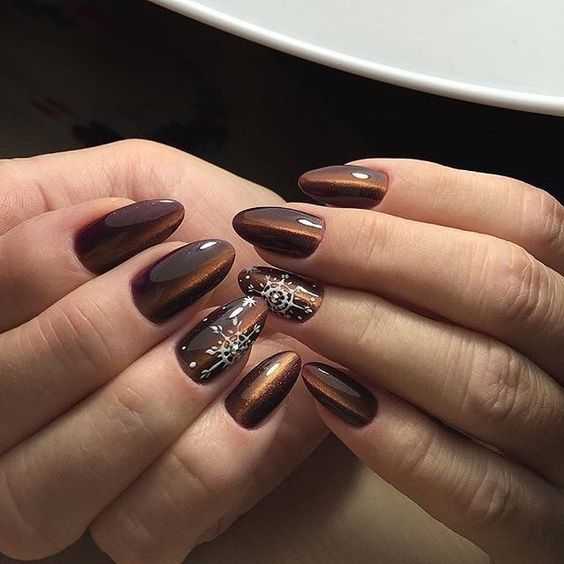 Пожалуй, наиболее натурально и красиво смотрится маникюр кошачий глаз в коричневой цветовой гамме. Такие тона позволяют имитировать оттенки соответствующего камня, поэтому дизайн сразу же пришелся по вкусу модницам. Но в отличии от предыдущих вариантов, в этом особенно уместным будет дополнительный декор. Это может быть имитация змеиной кожи, легкая роспись, стразы или даже контрастный декор на нескольких ноготках.