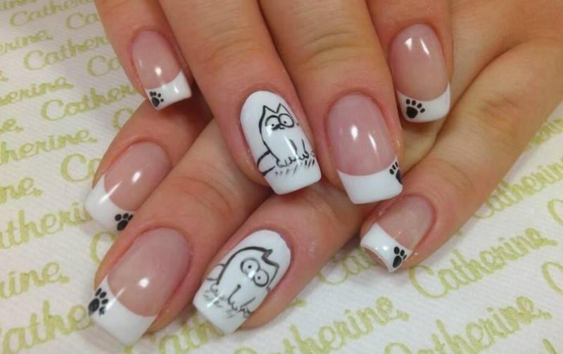 Возможно, вы даже и не знали, а кошачьим узором можно дополнить французский маникюр. Выглядит это эффектно и оригинально. Делается дизайн «Кошки» следующим способом: