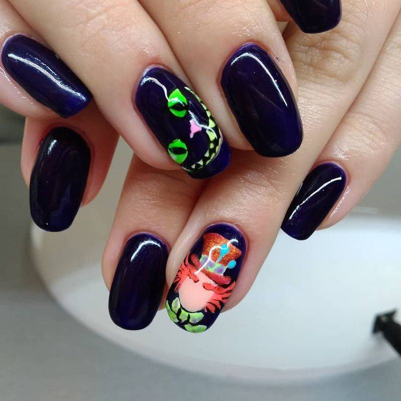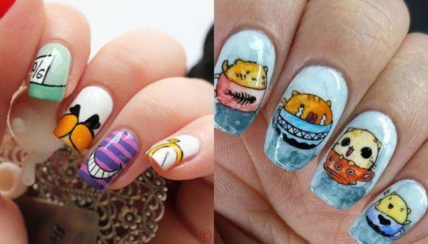 Суть метода в том, чтобы сделать рисунки разными цветами, к примеру, на одном ногте желтая кошка с глазками, на втором – красный силуэт с глазами синего оттенка. Делайте акцент на яркости, контрасте.
