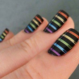 Лента для ногтей – это самоклеящаяся лента, с лицевой стороны которой она цветная, а с изнаночной – клейкая основа. Полоска для маникюра представлена в магазинах в огромном количестве: множество цветов, разная длина и ширина. Подобрать цвет и оттенок не составит труда, ровно, как и ширину ленты. Однако при помощи тоненькой ленты созданный маникюр получается более аккуратным, также тоненькая лента отлично подчеркивает маленькие детали рисунка на ногтях. Доступная цена данного материала позволяет покупать его наборами, что способствует увеличению вариантов возможного маникюра.