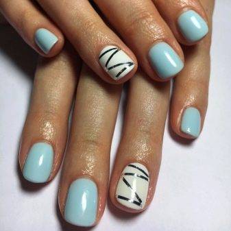 Еще один интересный и актуальный вариант полосатого маникюра. Вместо белой базы вы можете выбрать голубую. Палитра последней очень разнообразна — от холодного ледяного до электрик. И все они прекрасно сочетаются с черными акцентами.
