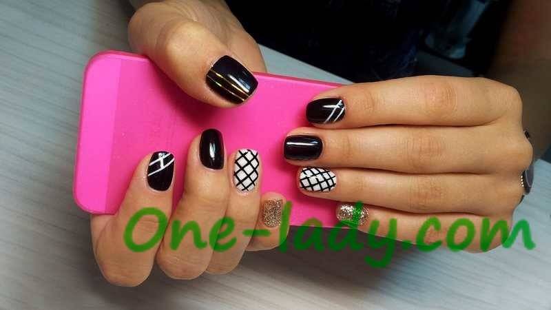 - Приклеить золотую ленту: вдоль, поперек, наискосок или создать клеточку и ромбики из них, возможно, имитировать лунный маникюр – у основания ногтя на черный лак приклеить золотую ленту. Дизайн зависит от неограниченной фантазии женщины;