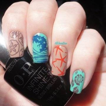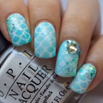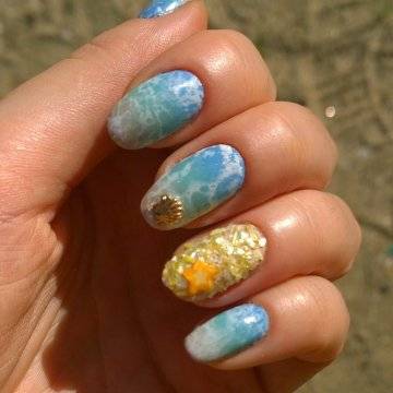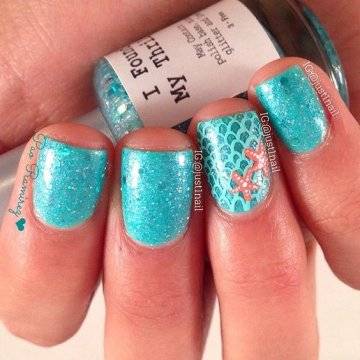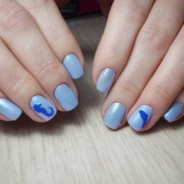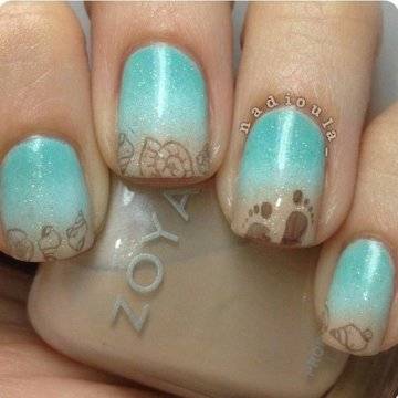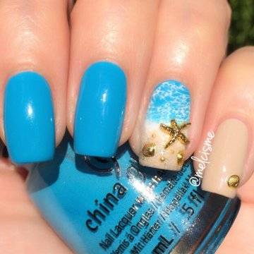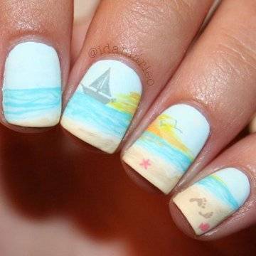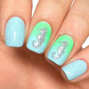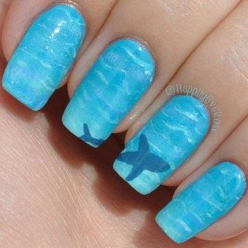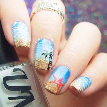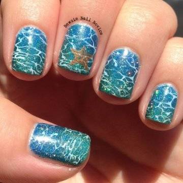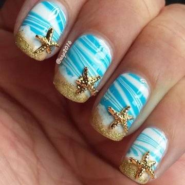 •	чешуйчатый маникюр – очень интересным решением считается взятая за основу чёрная глянцевая база с последующим нанесением на неё одинаковых вырезок из фольги в виде рыбной чешуи. Фольга при этом может быть как однотонная, так и с переходом в стиле омбрэ из одного цвета в другой – эффект невероятный;•	лазурный мрамор с белыми трещинами – применение мраморного эффекта на короткие ногти с созданием лазурного цвета основы и имитации на ней белоснежных трещинок в какой-то мере напоминает подводный узор морского дна;•	стикера с фото-принтами – лёгкий и невероятно красивый вариант, предполагающий нанесение на заранее обработанную ярким цветом в заданной тематической манере основу клейких стикеров с изображениями сноубордистов на морских волнах или загорелых красоток в очках и купальниках. Словом, можно подобрать любые варианты заготовок с фото-принтами, они в любом случае будут смотреться необычно и интересно.