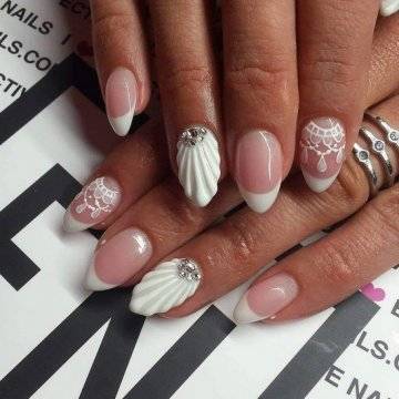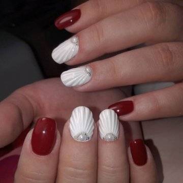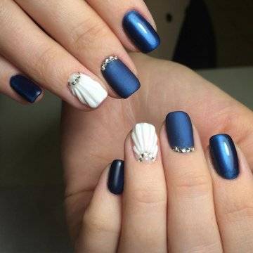 •	дизайн с ракушками из камифубиков – здесь, опять-таки, можно брать различного цвета основу. Это может быть не только иссиня-чёрный или небесно-голубой: цвет можно выбирать и сиреневый, и песочный, и белоснежный – важен сам факт нанесения на его поверхность золотистых и серебристых камифубиков в виде ребристых рельефных ракушек;•	жемчужный маникюр – на заранее проработанную сине-голубым и песочным цветом поверхность ногтевой пластины можно нанести несколько белоснежных мелкокалиберных бусин в виде жемчужинок в затемнённую пигментом прикорневую зону, имитируя, таким образом, прибрежный пейзаж с выброшенными на берег морскими красотами;•	морские звёзды – исполосованную в бело-синем тональном исполнении поверхность ногтей можно разбавить дизайном со стразами в виде золотистых камешков, выложенных в форме отдыхающих у прибрежных массивов морских звёздочек – смотрится подобного рода нейл-арт шикарно.