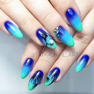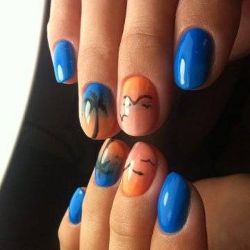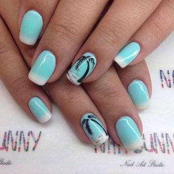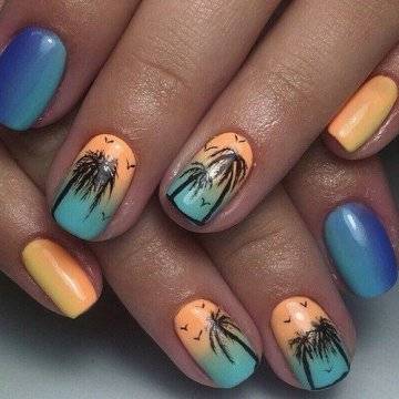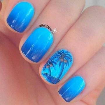 Маникюр с пальмами, в котором, как правило, преобладают все небесные оттенки от рассвета до заката, помогает подобрать палитру тонов, идеально сочетающихся с купальником и любым летнем нарядом, ни в чём себе не отказывая.