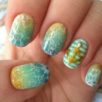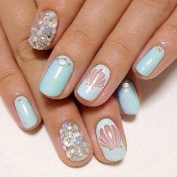 Морской нейл-арт не обязательно использует только синий цвет. В следующем сезоне роскошные оттенки этой гаммы цветов: бирюзовый, аквамарин, жемчужно-голубой, небесно-голубой обязательны для маникюра на море.