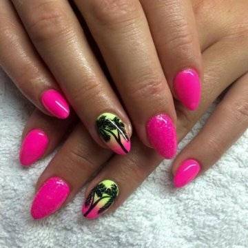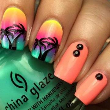 Модный неоновый дизайн ногтей 2021 фото новинки Тропический маникюр «Пальмы» создаст нужное настроение перед долгожданным летним отпуском или добавит красок в зимние будни. Выполняется он красками для китайской росписи и двумя кисточками — обычной тоненькой и веерной. В салоне такие рисунки стоят довольно дорого, поэтому можно попытаться создать их в домашних условиях. Дорогие девушки и женщины, хотим поделится с Вами идеей педикюра, который напомнит о лете и теплом солнышке. Ведь лето это самое жаркое и прекрасное время года. С помощью педикюра и маникюра можно окунуться в тропики, и не имеет значения тот сезон, что у Вас за окошком.