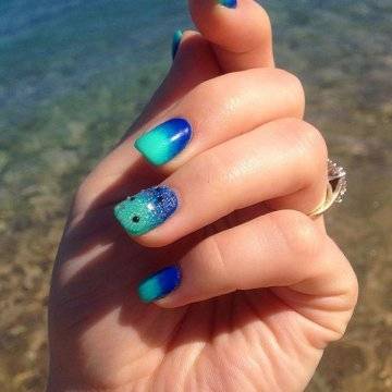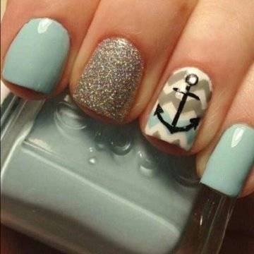 •	ультрамариновый глиттер – чудесный выбор в плане лёгкости и долгосрочности в носке, характеризующийся частичным нанесением на некоторые ноготки сплошного покрытия из глиттерных блёсток, а на оставшуюся часть – нанесением белоснежного гелевого глянца;•	серебристая слюда – имитируя прибрежную морскую пену, нанесенная в прикорневую зону серебристая слюда с мягким своим переходом в нежную голубую морскую гладь отлично смотрится на ногтях, передавая то самое воодушевлённое настроение, которое должно посещать каждую девушку перед поездкой в долгожданный отпуск на море.