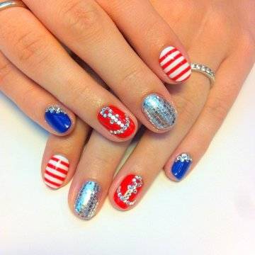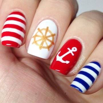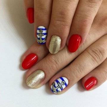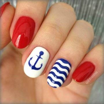Красный. Хит сезона, волны модно рисовать на ногтях синим, а якорь красным.