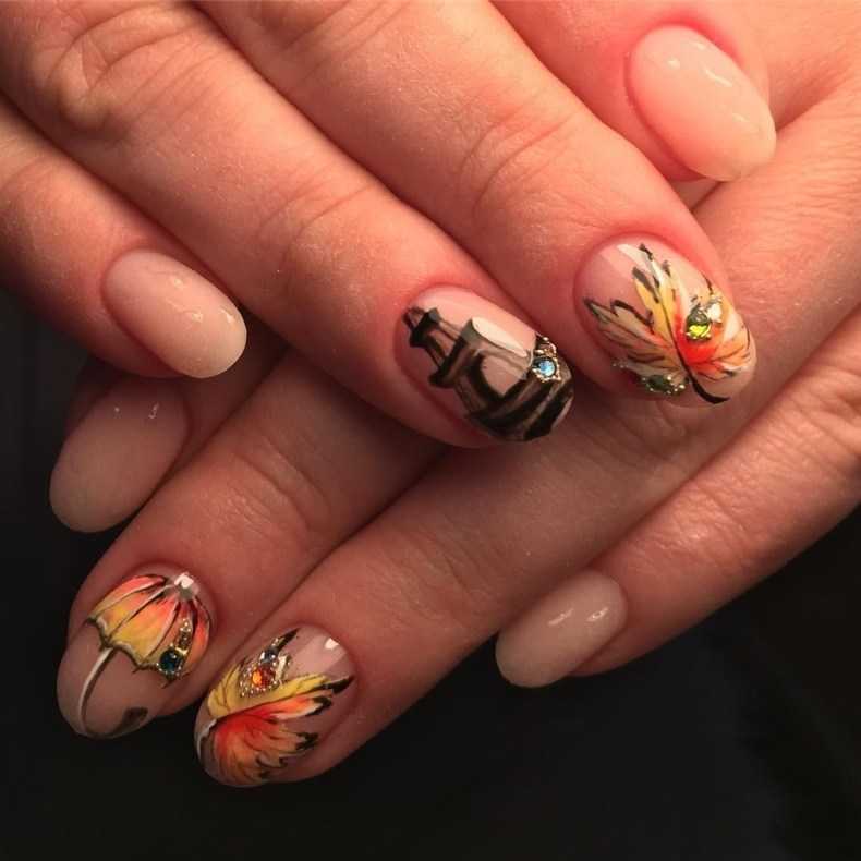 Часто осенний маникюр дополняют божьими коровками, ежиками или грибочками, оживляя рисунок и делая его максимально реалистичным.