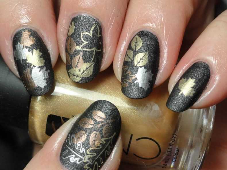 Маникюр с осенними листьями будет смотреться шикарно, если золоченый орнамент кленового листа поместить на темный фон (вишневый, синий или бордовый).