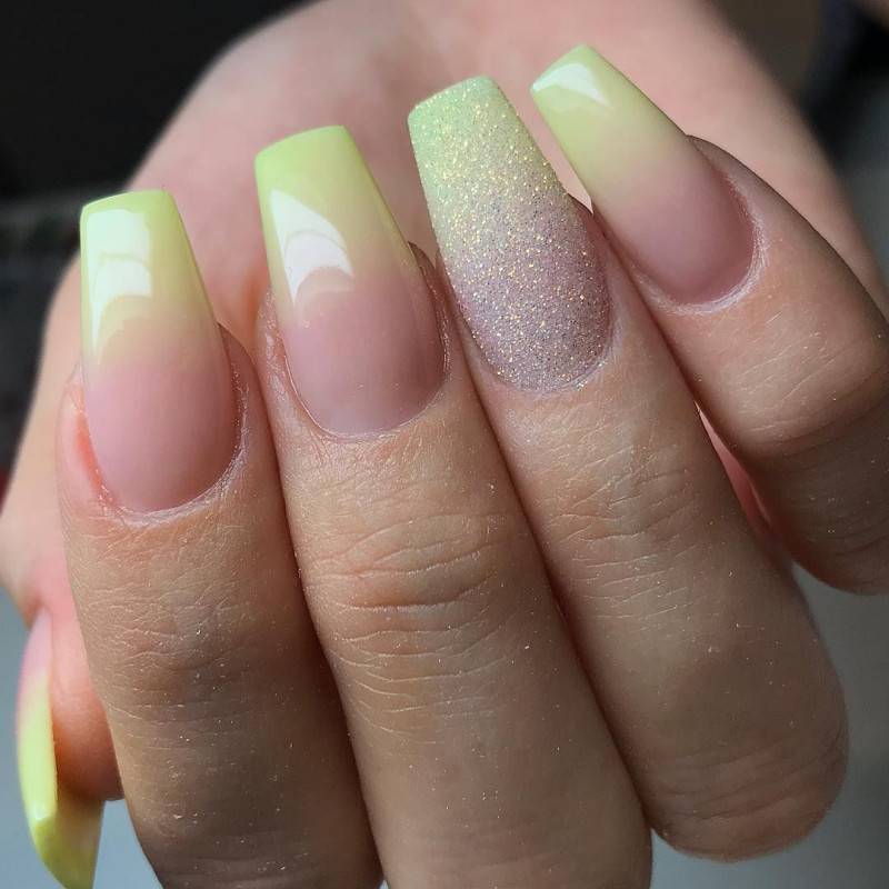 Очень стильно смотрится вариант, где один или два ногтя окрашены в однотонный цвет, который присутствует в «градиенте». Например, градиентный маникюр состоит из желтого и персикового лаков. Если один пальчик кокетливо окрасить в цвет персика, то этот ход и послужит оригинальным декором. Фантазировать в этом направлении можно долго.