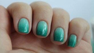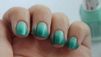 Подготовьте ногти к нанесению лака, сделайте маникюр; Нанесите защитную основу и тщательно высушите ее. Далее можно переходить непосредственно к выполнению перехода цвета. Существует два основных способа, как накрасить ногти с помощью губки; Способ первый. Накрасьте ноготь одним из цветов, слой должен быть плотным, но не толстым. После высыхания лака нанесите на спонж покрытие другого цвета так, чтобы одна часть окрашенной зоны была покрыта лаком более плотно, а другая – менее. Быстрыми движения прижимайте губку к пластине, начиная от середины, по направлению к свободному краю. По мере приближения к нему старайтесь постепенно сделать цвет плотнее путем более частого прикладывания губки; Второй способ, как сделать маникюр с помощью губки считается более сложным, однако переход получается плавне и граница начала второго тона абсолютно не различима. Вылейте на палитру оба оттенка лака так, чтобы они располагались вплотную друг к другу