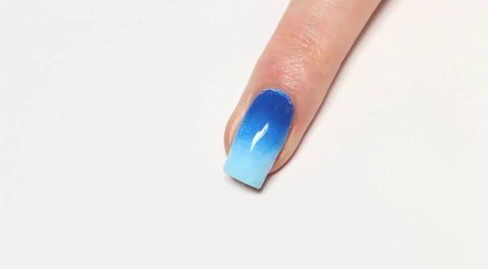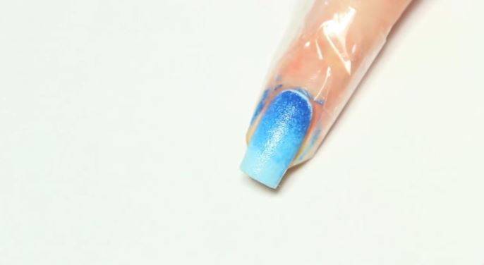 Затем осторожно, зубочисткой или иголкой, смешайте их по границе так, чтобы в результате получилось плавное изменение цвета из одного в другой через третий, тот, что получился при смешивании. Окуните губку в лак, а затем промокните ногти губкой одним движением, как на фото