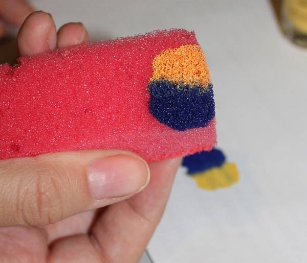 - Губку смочите в воде, отожмите и обмакните в краску.