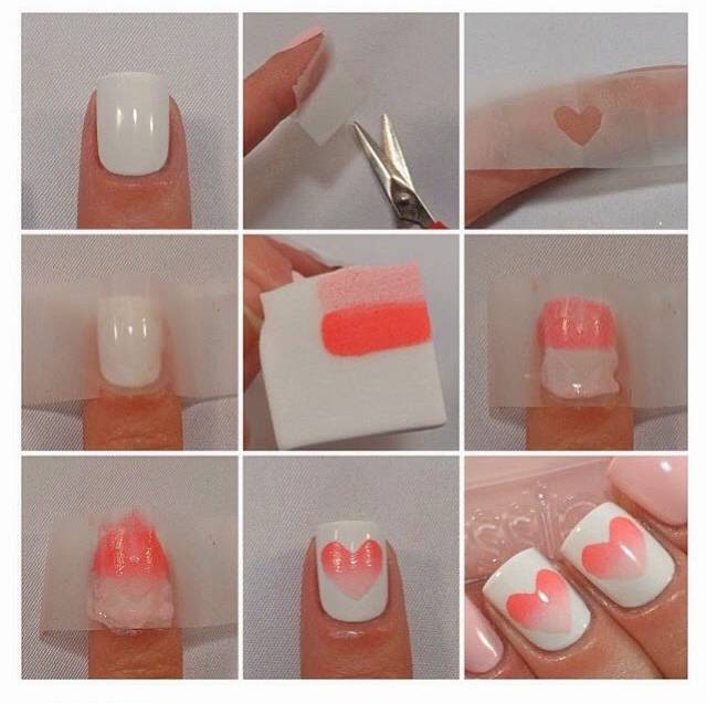 Следующий вариант омбре на ногтях подойдет молодым девушкам. Берут два цвета – розовый или коралловый и основной, белый. Сначала светлым слоем покрывают все ногти, затем просушивают и начинают работать над маникюром губкой (фото ниже в статье). На поролон намазывают кисточками два оттенка и придавливают подготовленный штамп не на сам ноготь, а на вырезанное из полиэтилена сердечко. Шаблон убирают поднятием точно вверх и только потом высушивают ноготь под УФ-лампой. Останется нанести закрепитель и вторично все просушить.