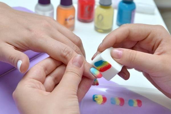 Опытные мастера маникюра сокращают процесс нанесения радужного покрытия до одного этапа. На спонж наносится сразу несколько цветов лака, после чего рисунок прижимается к ногтю: