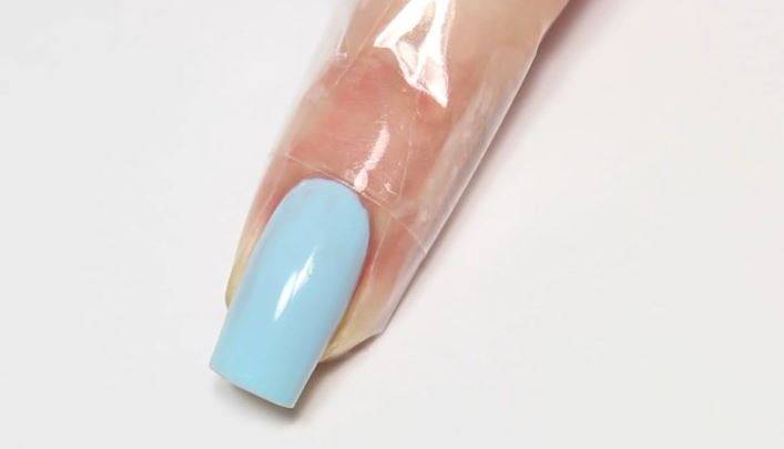 Область вокруг пластины очистите корректором для маникюра или ватными палочками, смоченными в жидкости для снятия лака; После высыхания цветного покрытия покройте ноготь топом, обязательно запечатывая срез свободного края.