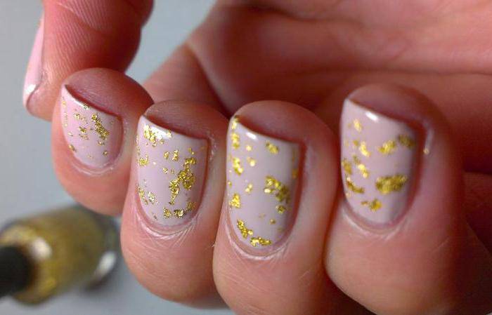 Лак выбранного оттенка наносится на базу и просушивается в лампе. Для этих целей также можно использовать гель-лак. На липкий слой накладываются кусочки слюды, захваченные с помощью плоской кисточки, хорошо разравниваются, равномерно распределяются по поверхности ногтя и сушатся в течение двадцати секунд. Сверху наносится финишный слой, и маникюр готов.