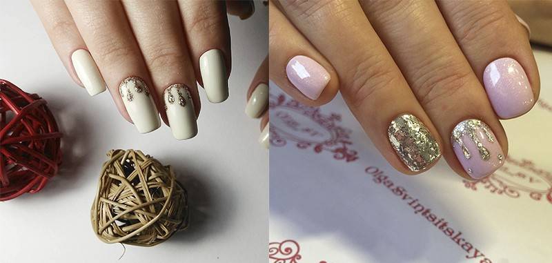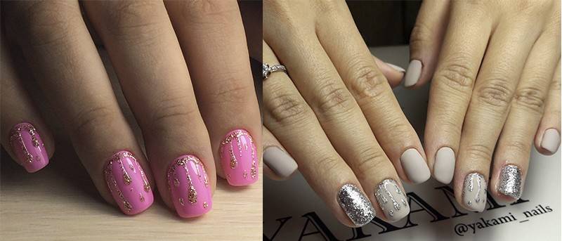Техника сверкающего дождя и расплавленных капелек-струй не теряет своей популярности. Особенно интересно такой nail-art смотрится на пастельной гамме, бежевых и околорозовых тонах. Беспроигрышным также будет сочетание бриллиантового или золотого дождя с матовыми (бархатными) ноготками. Такие образы напоминают драгоценные ожерелья и придают вашим пальчикам особый шарм.