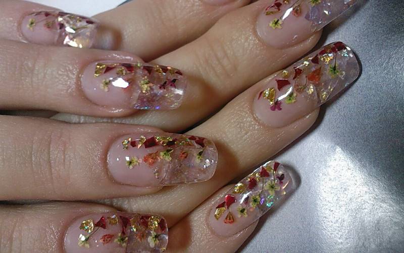 выкладывать слюду на гель (она будет закрепляться за счет липкого слоя); - выкладываем следующий слой акрила или геля