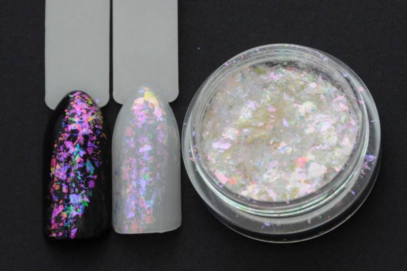 Слюда для создания маникюра – декоративный и легкий, синтетический материал, представляющий собой маленькие кусочки фольги или стружки, небольшие блестящие или голографические пластины, с разной формой, цветом и размером. Этот элемент дизайна называется так из-за того, что схож с природным минералом по форме и блестящим эффектам, появляющимся в солнечную погоду.
