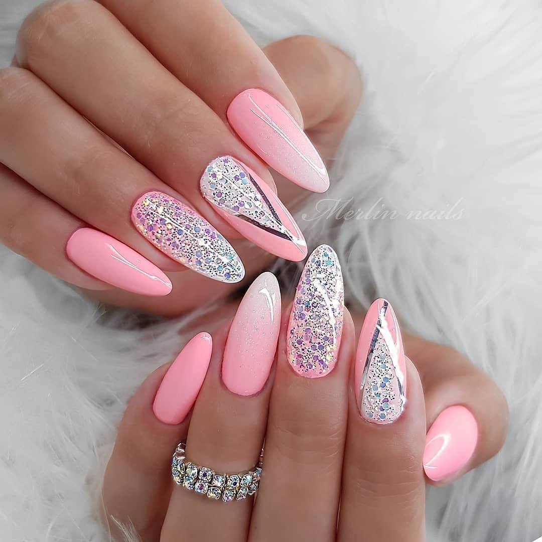 - Маникюр со слюдой и фуксиевым цветом. Фуксия придаёт маникюру яркий и смелый вид, что подойдёт для модных девушек.