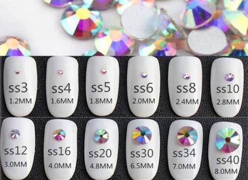 Размер стразов обозначают буквами и цифрами. Так, самый мелкий камешек (0,8 мм) имеет маркировку ss3, а самый большой (8,8 мм) — ss40. Каждый производитель украшений для маникюра имеет собственную таблицу, где есть фото ногтей в натуральную величину с наклеенным кристаллом. Под каждой фотографией написаны размер и маркировка страза.