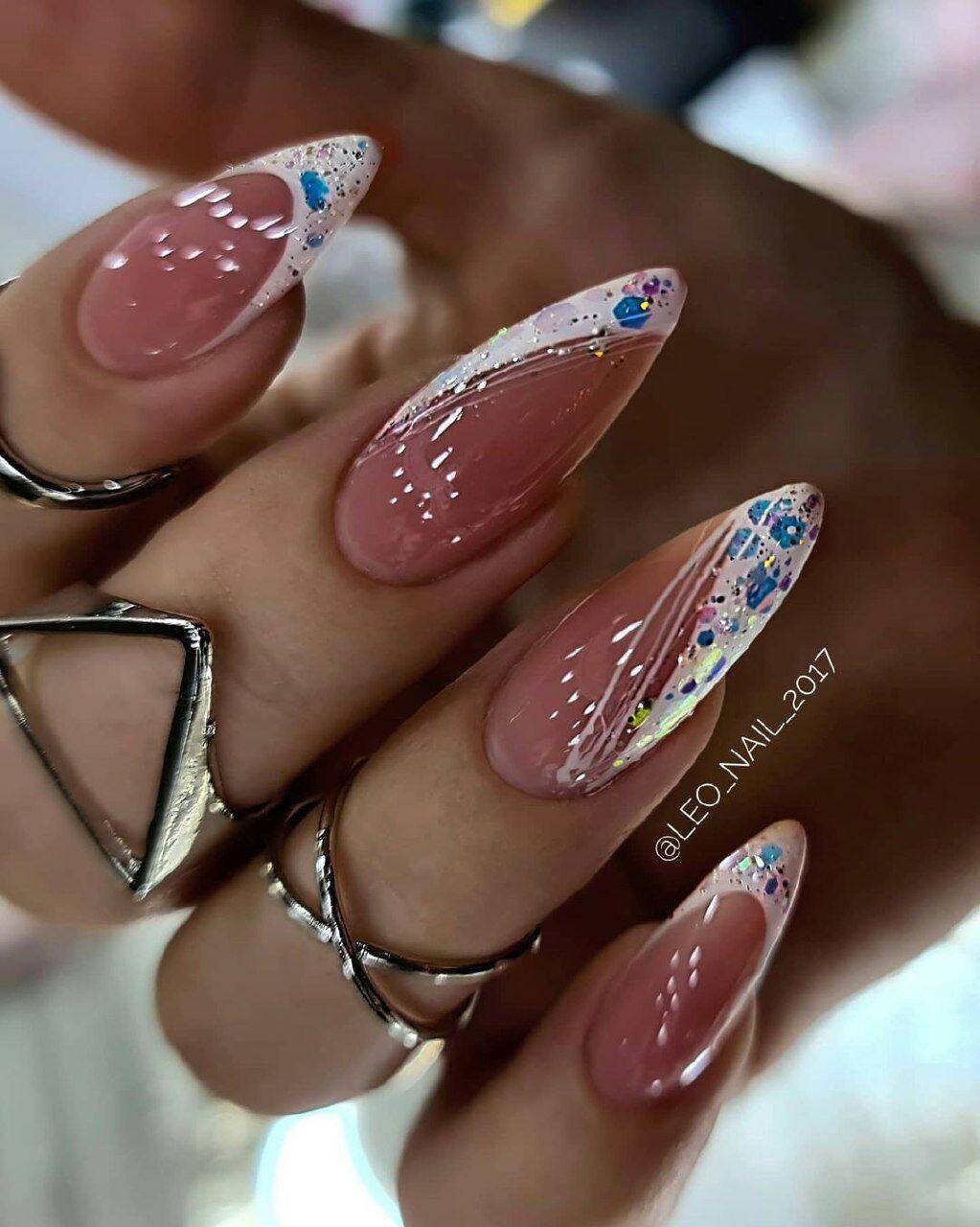 Именно любимый нами классический френч маникюр миндальной формы с использованием нейл-декора, например, стразами или блестками, самый удачный выбор для свадебного маникюра. Можно разнообразить миндальный френч разноцветной «улыбкой»: каждый ноготок будет иметь яркую разноцветную окантовку, которую можно дополнить стразами. При наращивании ногтей миндальной формы нейл-мастера часто предлагают такой вид дизайна как «аквариум», в котором спрятаны блестящие детали, красиво играющие в лучах света.