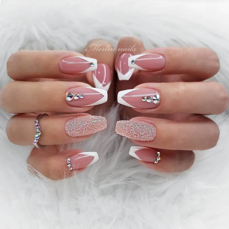 Нотку романтичности маникюру можно добавить, если выложить из декора определенный рисунок. Это может быть бантик или сердечко. Такие детали никогда не остаются без внимания, независимо от цветового покрытия. При желании можно нанести и более сложный рисунок с помощью страз. Это может быть корона, эйфелева башня или бабочка, стрекоза. Чтобы его подчеркнуть, используйте более темные оттенки лака. Еще один популярный вариант использования страз — выкладной френч. То есть вместо белой полоски на линии улыбки наносят стразы. Они могут быть классическими прозрачными или же розовыми, нюдовыми, более яркими. Каждый вариант смотрится очень красиво. На самом деле такое оформление — это творческий процесс, где можно дать волю фантазии и реализовать любую понравившуюся идею.